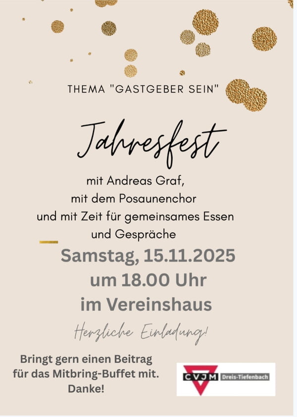 Am Samstag, 15. November 2025 wollen wir um 18.00 Uhr im Vereinshaus gemeinsam Gottesdienst feiern, gemeinsam singen, essen und eine fröhliche Zeit miteinander verbringen. Andreas Graf wird uns gedanklich mitnehmen in das Thema "Gastgeber sein".